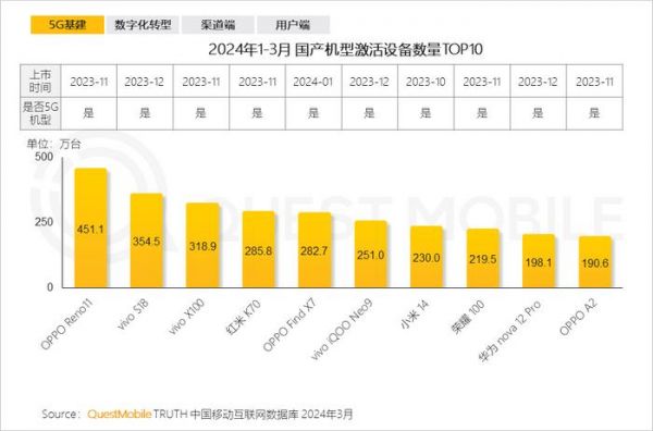 近日,市场调研机构QuestMobile发布的《2024中国移动互联网春季大报告》,就公布了1~3月国产机型激活设备数量TOP10,向我们揭开了一季度的销量数据。