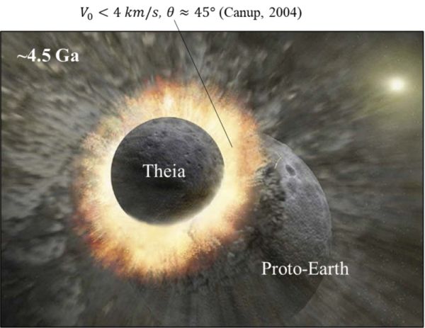 约45亿年前,太阳系形成之初。一颗约火星大小(半径~3000 km, 地球的一半)的远古行星——忒伊亚(Theia),偏离了自身轨道,以约45°倾角、较高的初始速度(但小于4 km/s)与原始地球发生正面碰撞[9]。