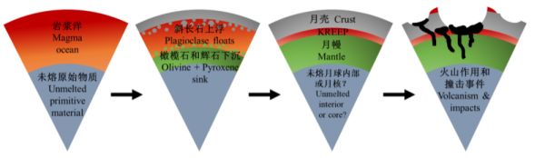月球岩浆洋模型及初始圈层结构示意图(改编自National Research Council[17],据刘岢城[18])