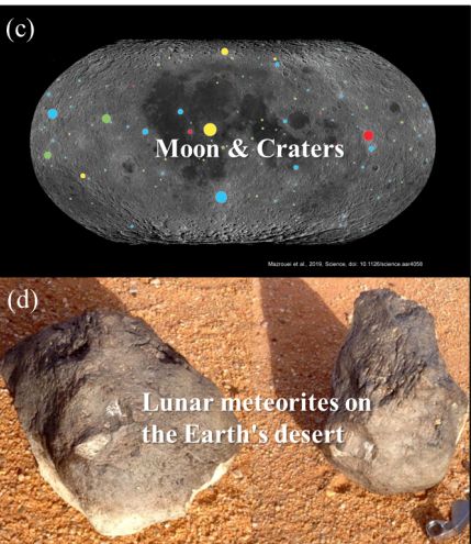 a-月球受陨石撞击溅射碎片; b-月岩碎片被地球引力场捕获;c-月球部分撞击坑分布图;d-地球沙漠发现的月球陨石。(由a~d底图来源: IGNAT; Erik Simonsen; Mazrouei et al. 2019; Ahmad Bouragaa)