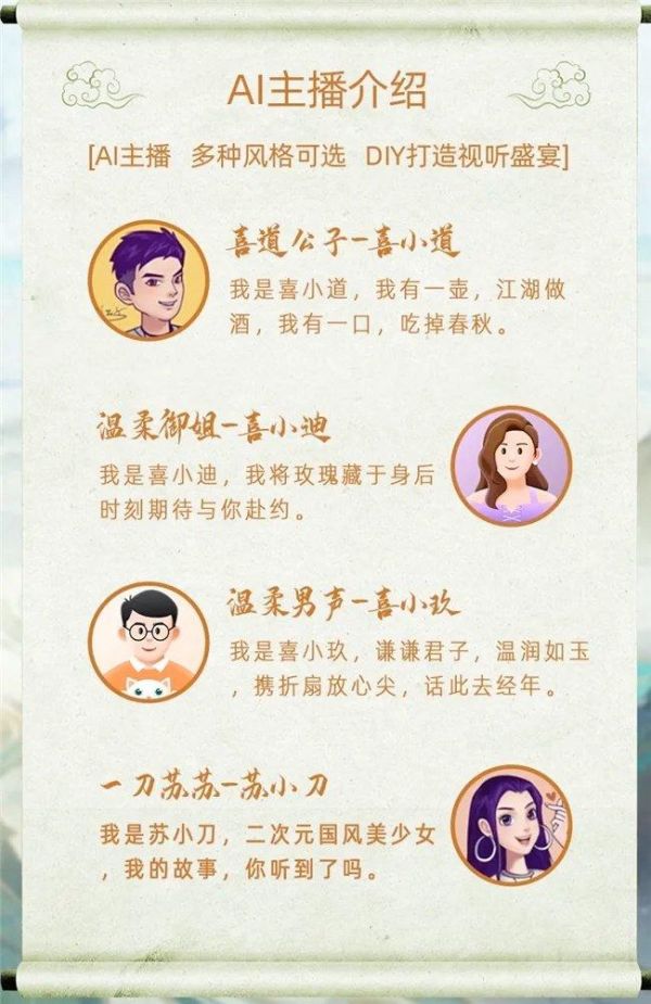 如今,打开喜马拉雅APP,我们能在电视剧《庆余年2》上线前提前听到其有声剧,还能听到科幻巨著《沙丘》、游戏动漫作品《刺客信条》、奇幻名作《哈利·波特》等;能听到AI合成音精准还原的单田芳“云遮月”嗓音,还能听到AI主播“喜小道”的带感声音。