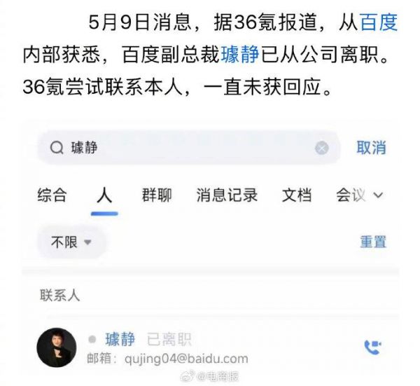 百度公关副总裁璩静已离职