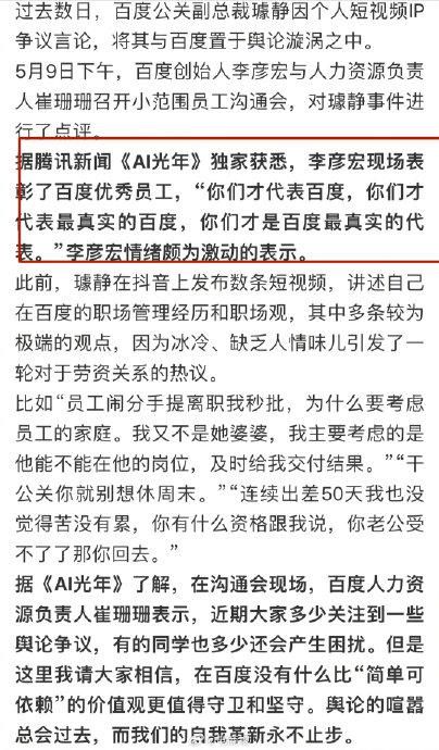 李彦宏高情商点评“百度前副总璩静秒批离职等言论争议”…