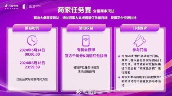 针对用户,抖音特别推出了官方立减和一件直降两大玩法,通过直接给予用户立减优惠或售价直降的方式提升商品价格力,刺激用户下单转化。 针对商家,抖音商城618好物节则创新地推出了“商家任务赛”玩法,鼓励全量商家积极参与,为商家量身定制了独特的营销体验。
