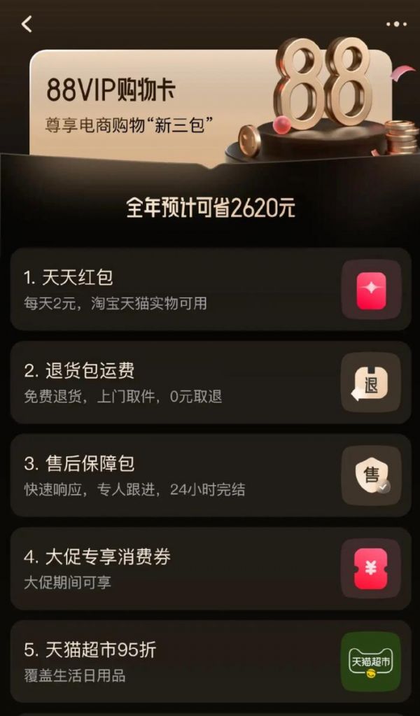 以淘宝为例,自去年双11起,其持续为尊贵的88VIP用户升级各项权益,不仅新增了“购物卡”和“全能卡”,更精心策划了包含天天红包、退货运费包和售后保障包的电商购物“新三包”权益,为高质量消费人群带来了更加优质、便捷的购物体验。