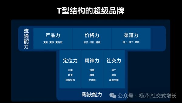 下面的“丨”代表着一个品牌的稀缺能力,包括占据消费者某个使用场景的定位力、引发消费者共鸣的精神力、用户和合作品牌构成的社交力。