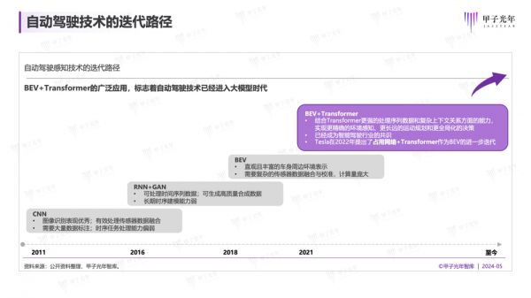 纵观自动驾驶技术的发展历程,人工智能的不断突破显著提升了自动驾驶的感知性能。从卷积神经网络(CNN)的引入,到循环神经网络(RNN)的应用,再到结合鸟瞰图(BEV)与Transformer模型的创新,每一次的技术进步都在增强自动驾驶的精确度与安全性。