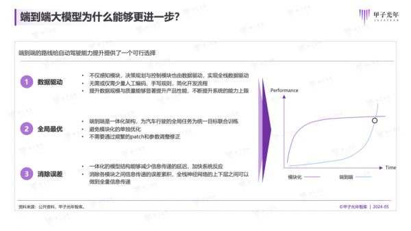 而端到端架构则有所不同,它比模块化的系统架构更加简洁。狭义的端到端模型并不拆分感知、规划、控制等模块。相反地,端到端模型是一体化的,传感器信号作为模型的输入,输出则直接用于车辆执行器的加减速与转向的指令。在足量优质数据与充沛算力的加持下,进行统一训练。随着自动驾驶领域数据量的持续增长,为训练更为先进的决策模型提供了条件,使得端到端的自动驾驶模型成为可能,为未来彻底解决人工接管问题打好基础。