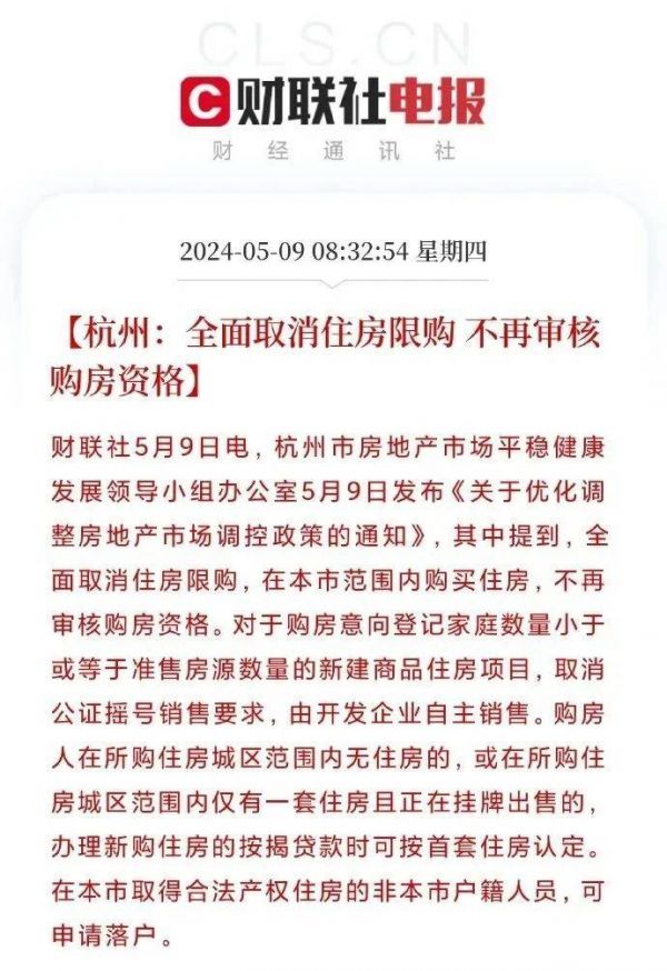 5月9日,杭州发布“楼市全面取消限购”政策。