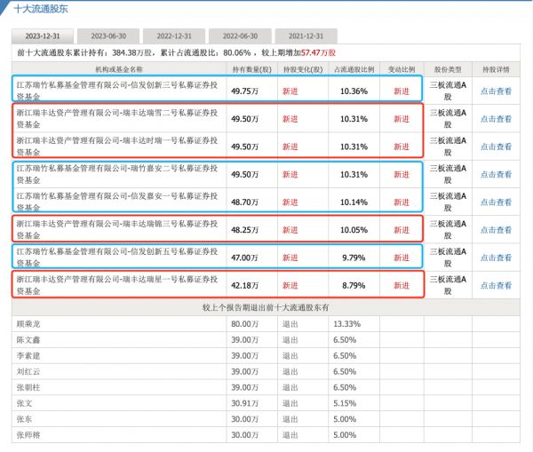 那究竟瑞丰达是否存在通过对倒新三板股票拉高股价,再为人接盘的情况?凤凰网《风暴眼》梳理了多家流动性极低但股价暴涨的新三板上市公司年报,的确发现一些猫腻———它们的前十大流通股东中都新进了两家操作高度同频的私募,其中一家正是瑞丰达,另一家名为江苏瑞竹私募基金管理有限公司(以下简称瑞竹)。