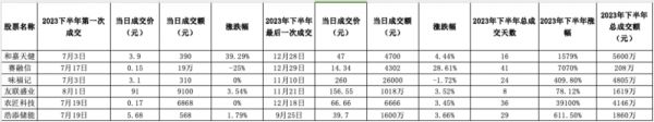 农匠科技在2023年下半年只有36天有成交,其中32天开盘价与收盘价相同,但是股价暴涨了39111.76%(除权),若按前复权统计,涨幅更是高达48914.71%,总成交金额只有4145.72万元。