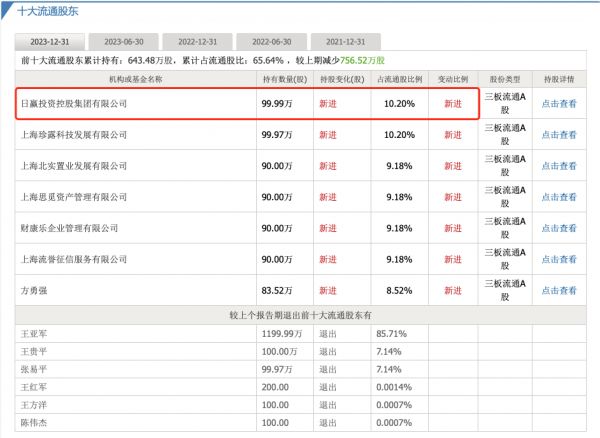 还有1只个股与前述5只个股的情况类似,名称为赛融信。瑞丰达和瑞竹均没有出现在赛融信的前十大流通股东名单中。但是,前十大流通股东均为新进,而且第一大流通股东名为日赢投资控股集团有限公司。持股数量99.99万股,占流通股比例10.2%。