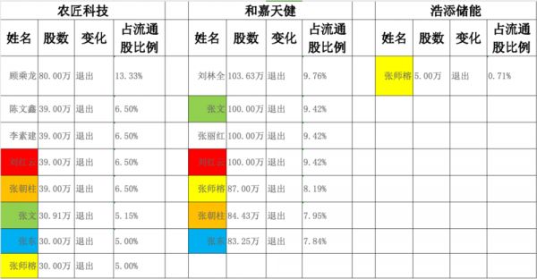 而张师榕同时出现在农匠科技、和嘉天健和浩添储能三只股票的退出股东名单中。张师榕也是浩添储能唯一一个较上个报告期退出的前十大流通股股东,退出数量5万股,占流通股比例0.71%。