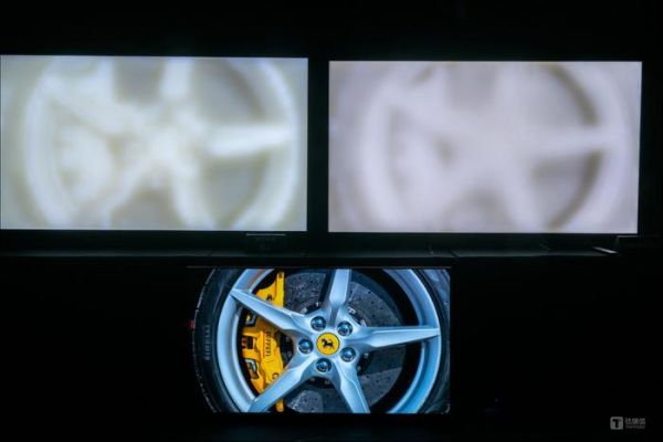 左侧是索尼9系,右侧是其他品牌产品,同样采用Mini LED背光(图片来源:钛媒体APP作者拍摄)比如这副车轮的画面就很典型,车轮辐条的镂空部分是阴影,也是能够勾勒出车轮立体感的暗部轮廓,那么对比底下的原始画面,显然左侧的索尼9系背光控制相比右侧其他品牌的电视对物体的轮廓还原更加精细,这就是22bit灰阶控制技术的作用。