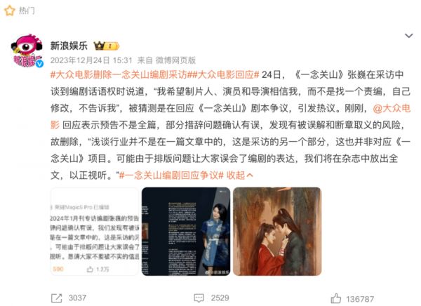 《一念关山》播出后,女主前后不一致的情感观念引起大众热议,编剧张巍在接受《大众电影》采访时谈到,“我希望制片人、演员和导演相信我,而不是找一个责编,自己修改,不告诉我。”这句话被外界猜测是回应《一念关山》的剧本争议,编剧的话语权问题再一次被放置到了台前。