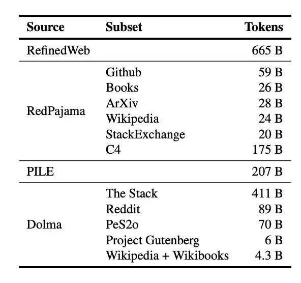 论文显示,该系列模型在来自 Reddit、维基百科、arXiv.org 等的 1.8 万亿个 tokens 的公共数据集上进行预训练。