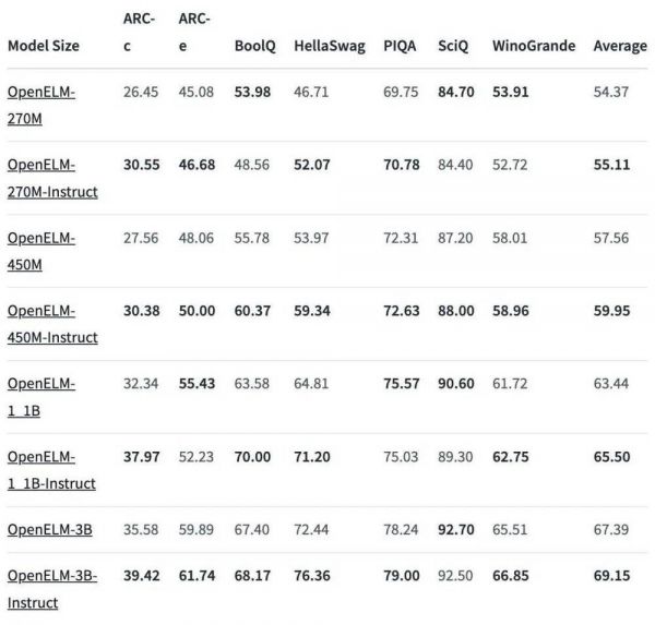 同时拥有 4.5 亿参数的 OpenELM-450M 不光胜在性价比较高,整体的得分表现也相当亮眼。