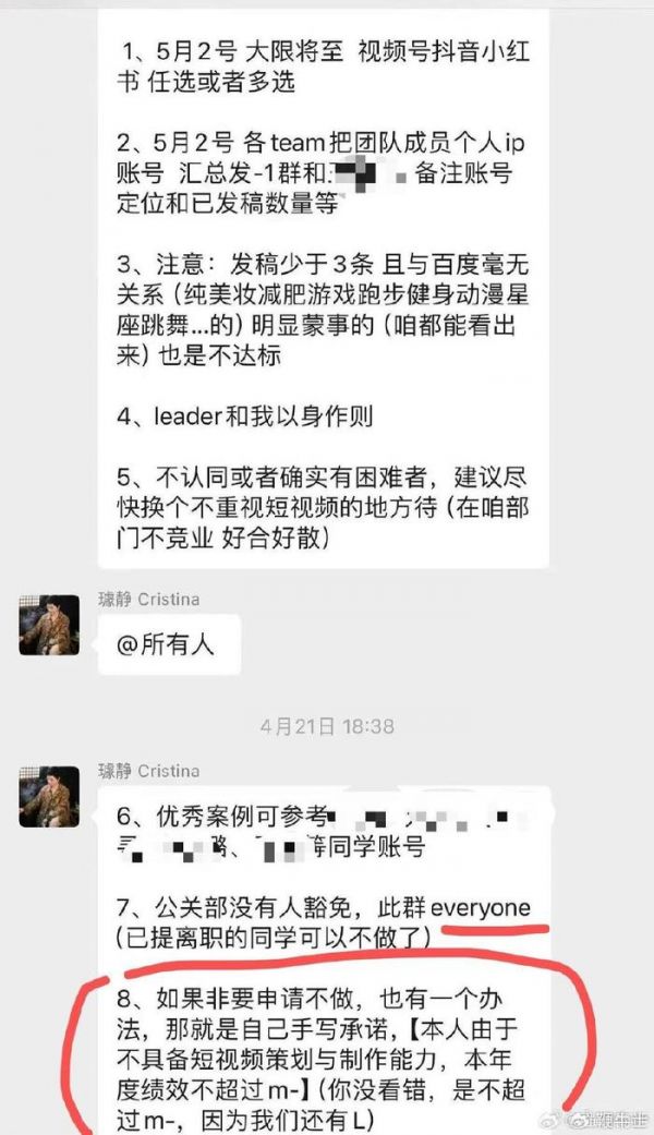 璩静在4月21日的工作群聊天又显示这是其推进全员短视频的策略,5月2日是大限,看起来又像是其履行工作职责的一部分。