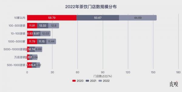 (据美团数据,2020-2022年,门店规模在“5000-10000家”的茶饮品牌在行业内明显增多,数量占比已从2020年的2.53%上升到2022年的8.69%)