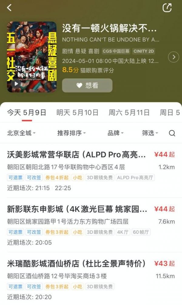 对出品方来说,撤档重映也很难挽救票房颓势,而对于影院方来说,猝不及防的撤档则会给他们带来已排片、卖票的场次产生的退票困扰。小娱联系了朝阳区一家热门影院的工作人员,对方表示自《火锅》官宣撤档几天来,一边是他们没有接到锁密钥通知,另一方面也有顾客电话咨询,为什么还有排片?着实让影院尴尬了一番。突然撤档,对电影行业生态链条中偏下游的一环会带来或多或少的影响。