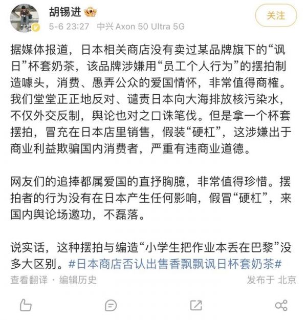 胡锡进也发微博评论香飘飘:涉嫌出于商业利益欺骗国内消费者。