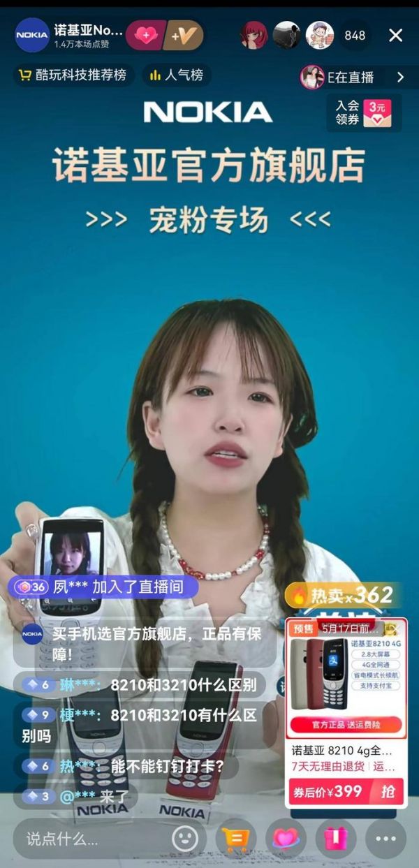 5月11日,扬子晚报/紫牛新闻记者在诺基亚抖音直播间看到,小黄车链接显示“3210”款手机已经售罄。主播说:“3210已经售空了,现在可以预约,5月31日晚上8点开售,售价379元。”页面显示,预约人数超过5000人。