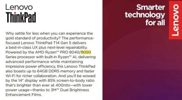 但这又引来了另一个问题:AMD 常常会在同一代产品中引入不同的工艺,而这套「全新」的命名法则中并未有标示制程工艺的位置。照这么看,这个全新的 AI 编号甚至还不如过去的「7640U」编号法。而且这还只是 Ryzen「主线」的命名方式,根据被曝光的联想新品介绍页,商用产品还保留着 Ryzen PRO 8040/8050 这一套命名体系,场面一度十分混乱。