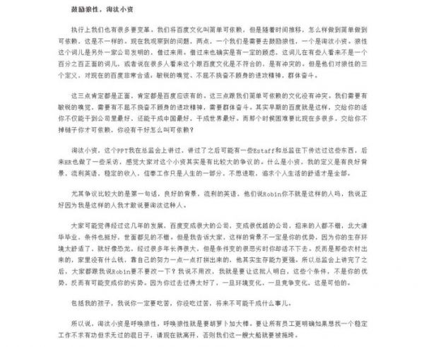 只是,时隔12年,人们对于百度公司、互联网行业、狼性、奋斗等等的看法,早已发生了巨变。12年前,狼性可能让一位基层互联网员工保持对财富自由的向往,持续努力工作,跟随公司上市而获得大量财富,还是能够触摸的梦想。12年后,一切都变得复杂且模糊起来。