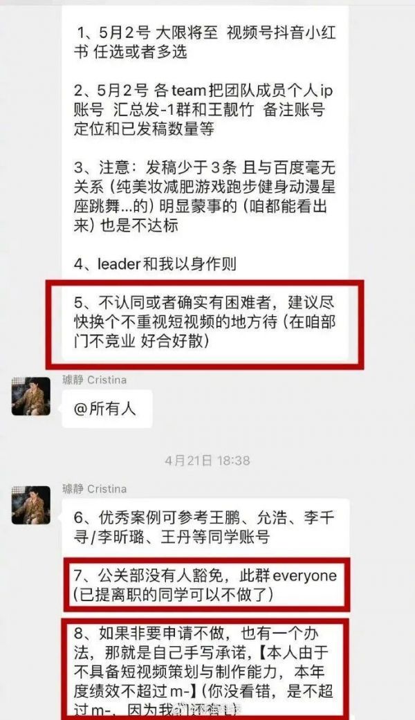 图:李彦宏全员信《改变,从你我开始》网络截图璩静的一部分特质,似乎是可以呼应到这里的。她在短视频中呈现的主要观点,都可以挂上“狼性”的标签。