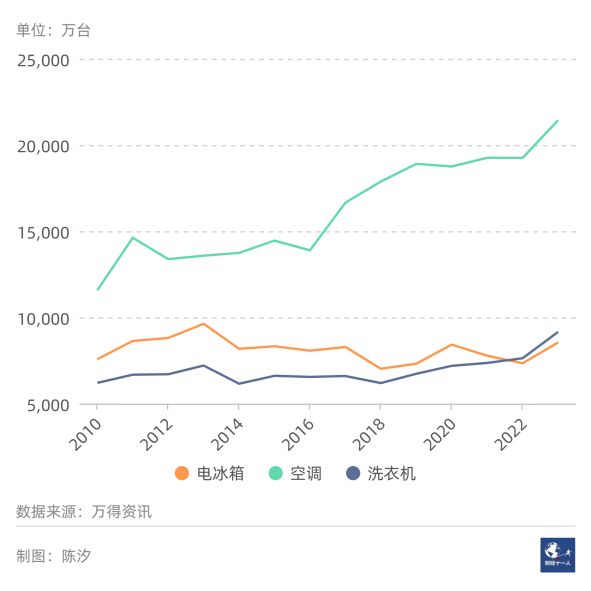 图4显示,以台数计,电冰箱和洗衣机的产量保持基本稳定,空调略有增长。但头部企业拥有品牌和技术优势,消费者愿意支付溢价。