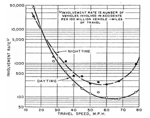 这个“所罗门U型曲线”表示,车速在100km/h(图中是英里制的60MPH)附近时,发生交通事故率反而最低,在速度低于它或者高于它时,事故率会增加。