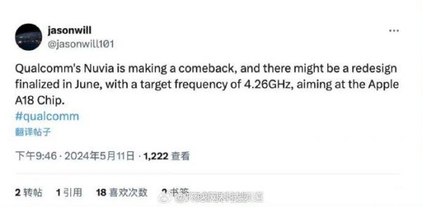 【消息称#高通骁龙8Gen4芯片重新设计迎战苹果A18#,目标频率4.26GHz】据消息源 jasonwill101 透露,高通公司目前正在重新设计骁龙 8 Gen 4 处理器,新的目标频率为 4.26GHz,这一变化主要是为了应对苹果 M4 / A18 / Pro 处理器。