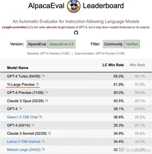 零一万物刚刚发布了新的千亿参数闭源模型 Yi-Large 和首个国内产品 “万知 AI”。在斯坦福的开源评测项目 AlpacaEval 2.0 上,Yi-Large 控制了文本长度误差的胜率(LC Win Rate)排第二,仅次于 OpenAI 今年 4 月发布的新版 GPT-4 Turbo;胜率(Win Rate)则排到了第一。