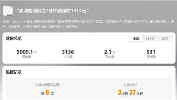 近日,一名上海网友在滴滴出行小程序中发现自己有一条未支付信息,竟然是2017年的一张1414元的出租车出行单子,而整个行程只有2公里左右7分钟。随后,该消息登上热搜。