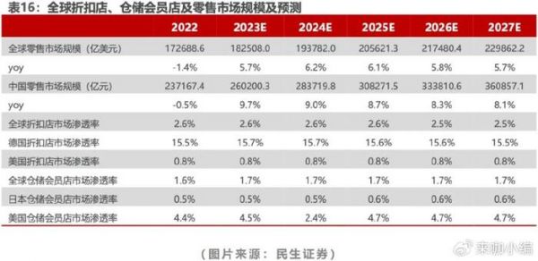 综合各种原因,近年来国内的折扣零售如火如荼,也是势在必行。根据民生证券的研报,预计到2027年,我国零售行业规模将达到36万亿元,目前我国折扣店渗透率还有较大提升空间,参照全球、德国(奥乐齐发源地)、美国的折扣店渗透率,在未来几年里,我国折扣店渗透率有望达到全球折扣店渗透率(2.5-2.6%),对应的折扣店市场规模将接近8000亿元。