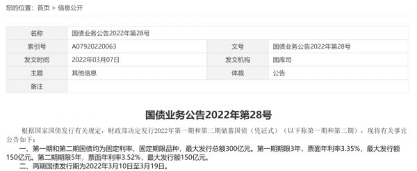 根据财政部的公告,今年第三期、第四期凭证式储蓄国债于5月10日至19日发行。两期国债均为固定利率、固定期限品种,最大发行总额300亿元。其中,第三期期限为3年,最大发行额150亿元,票面年利率2.38%;第四期期限为5年,最大发行额150亿元,票面年利率2.5%。