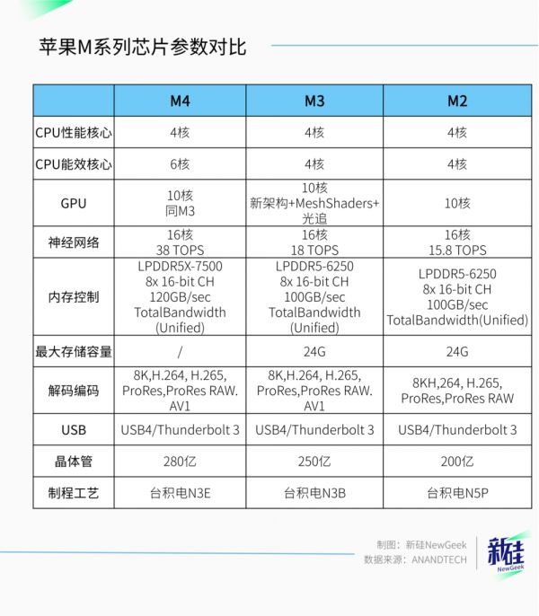 从参数上来看,M4芯片采用了台积电第二代3nm制程工艺(N3E),并配备当前AIPC主流的CPU+GPU+NPU组合。