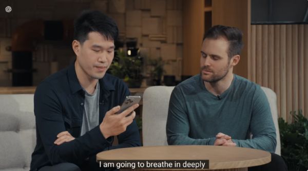 在第一段对话里,Chen对GPT说,自己有点紧张,然后开始急促地呼吸。GPT识别到了他呼吸的声音,说,别紧张,你喘得像个吸尘器,深呼吸,再吐气。接着GPT开始指导Chen怎么深吸慢呼平复心情。