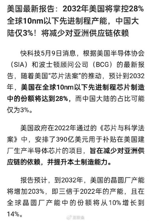 他们预计到2032年,美国要掌控全球28%的10纳米以下先进芯片产能,这胃口可真不小。再看看咱们这边,报告里预测只有3%。