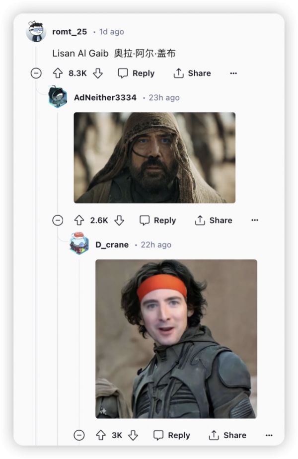 在X上,有人引用《沙丘》梗,高呼Lisan Al Gaib(救世主);《沙丘II》中男主角甜茶的形象,也被替换成了Keith Gill戴着红头巾的经典形象。