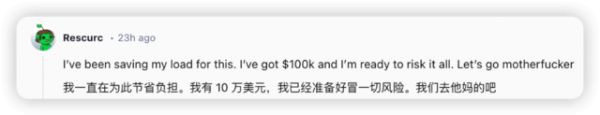 Reddit上有网友直言,自己在过去几年省吃俭用攒下了十万美元,已经做好了赌上一切的准备。