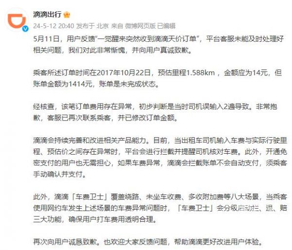 5月11日,用户反馈“一觉醒来突然收到滴滴天价订单”,平台客服未能及时处理好相关问题,我们对此非常惭愧,并向用户真诚致歉。
