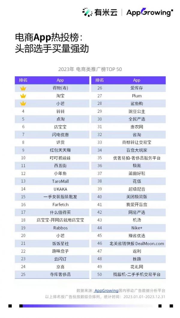 App Growing数据显示,2023年,转转位列2023年电商App热投榜的第4名。一面买量推广自家App,一面在博主短视频中打广告,一面在大主播直播间搞销量。