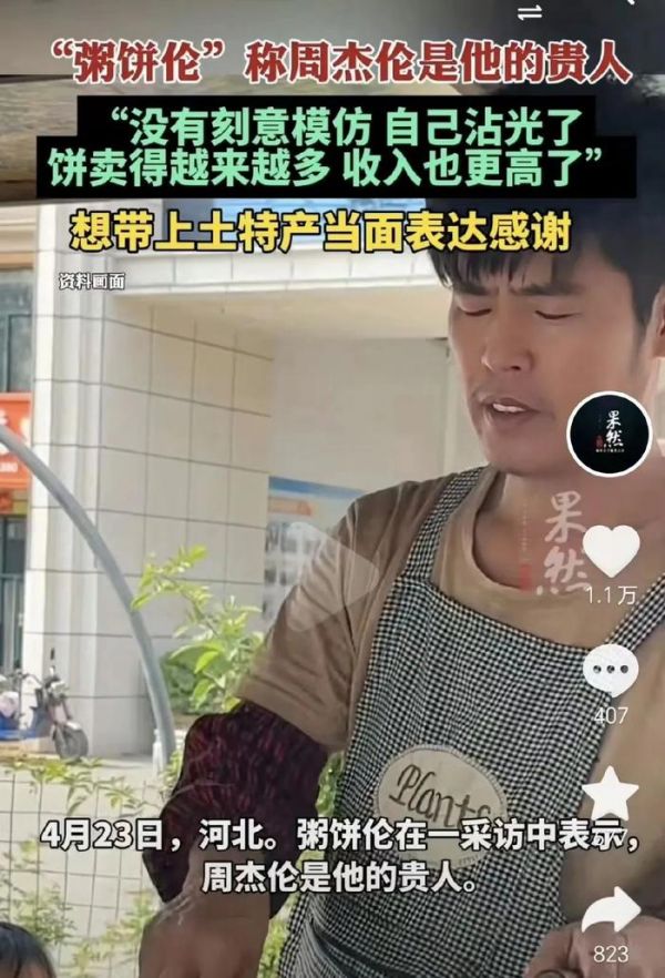 别人送他周杰伦联名的奶茶,粥饼伦也不白拿,选择用自己摊的灌饼做交换。