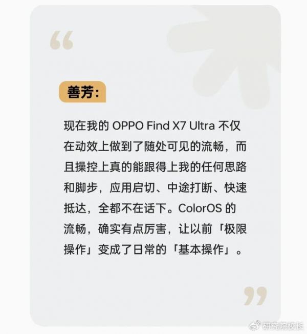 出色的流畅度也获得了不少OPPO/一加手机用户的高度肯定,比如一位ID叫“善芳”就评价道“ColorOS的流畅,确实有点厉害,让以前「极限操作」变成了日常的「基本操作」”。此外五一后的这段时间ColorOS用户体验与解决方案总监马新还对许多用户进行了电话回访,持续倾听用户的意见与建议,从而打造更好的体验。所以如果你想要有流畅、智慧、好用的日常用机体验,搭载ColorOS系统的OPPO/一加手机绝对值得首选。