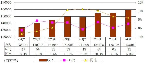 腾讯2024年第一季度营收为1595亿元,较上年同期的1499.86亿元增长6%,较上一季度的1552亿元增长3%。