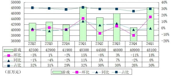 腾讯2024年第一季增值服务业务营收为786亿元,同比降0.9%,其中,腾讯游戏收入481亿,较上一季度的409亿元增18%,与上年同期基本持平。