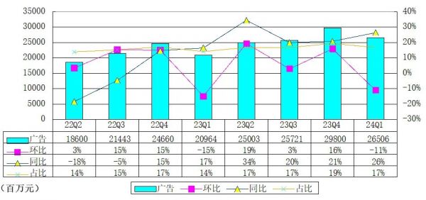 腾讯2024年第一季度网络广告业务收入为265亿元,同比增长26%,受微信视频号、小程序、公众号及搜一搜的增长拉动,受益于用户参与度的提升以及我们不断升级的AI驱动的广告技术平台。