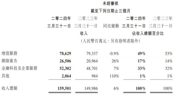 腾讯控股有限公司(港交所代码:00700(港币柜台)及80700(人民币柜台))今天公布截至2024年3月31日止第一季未经审核综合业绩。财报显示,腾讯2024年第一季度营收为1595亿元,同比增长6%。