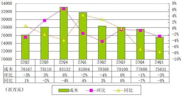 腾讯2024年第一季度成本为756亿元,同比下降3%,主要由于内容成本及云项目部署成本减少,部分被渠道及分销成本的增加所抵销。